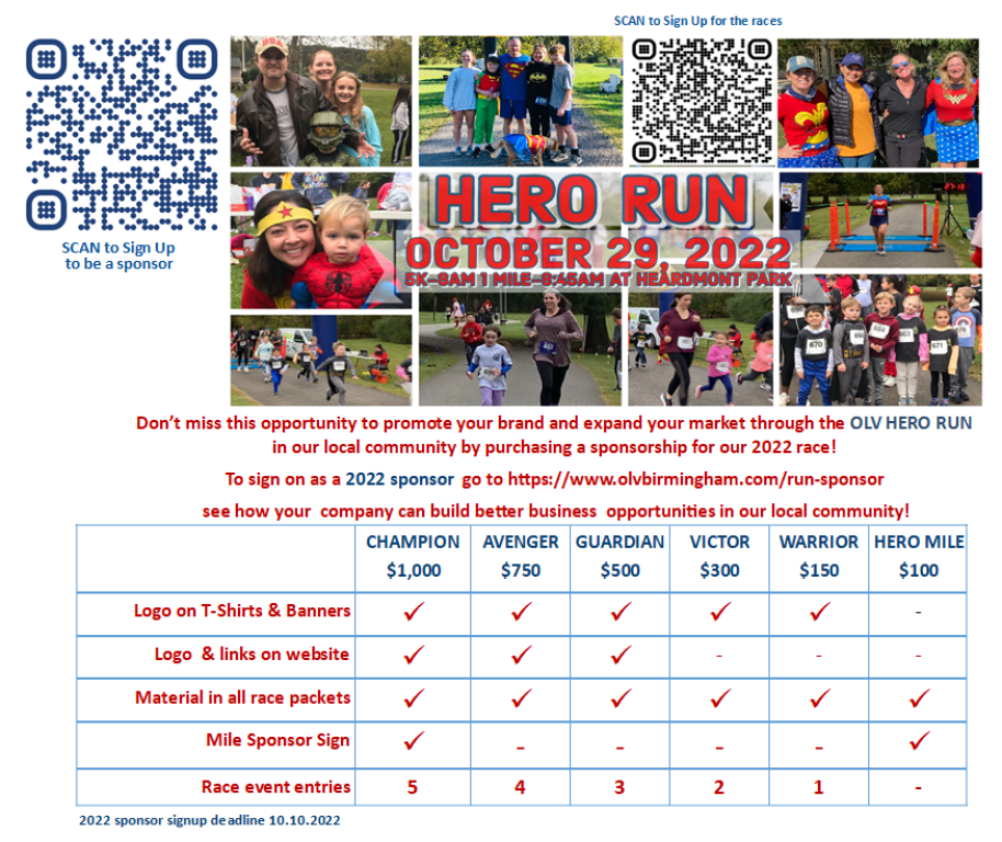 Don’t miss this opportunity to promote your brand and expand your market through the OLV HERO RUN in our local community by purchasing a sponsorship for our 2022 race!