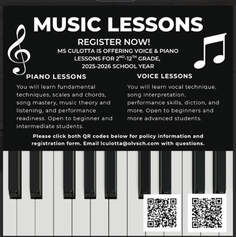 Private Piano and Voice lessons are conveniently available to OLV students on a first come, first served basis, according to availability of time slots for a particular grade level. Younger students may be interviewed, accompanied by a parent, to determine readiness. Whether it’s voice or piano, lessons combine technique and theory with artistry and performance. Lessons are tailored to each student’s age and ability and offer a variety of creative pieces that advance skills while offering the opportunity for students to discover the joy of music. Students showcase their passion for music at the annual Voice and Piano Recital held in May each year. Lessons are offered by Lauren Culotta, Minister of Music for Our Lady of the Valley Parish. For additional information, including fees and availability scan QR codes below or contact Ms. Culotta at lculotta@olvsch.com